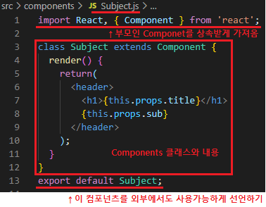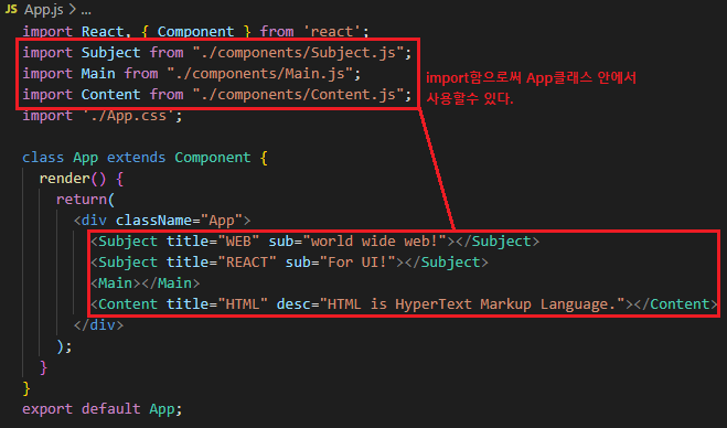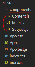 상위 컴포넌츠인 App.js에서는 import Subject from "./components/Subject.js"; 선언후 사용한다.