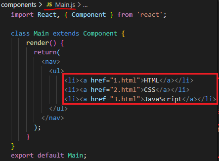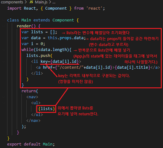 자, 원래 Main.js 코드이다. 빨간박스안의 하드코드를 쓰지않을거다. 하지만 결과는 똑같이 나오게 만들거다.
