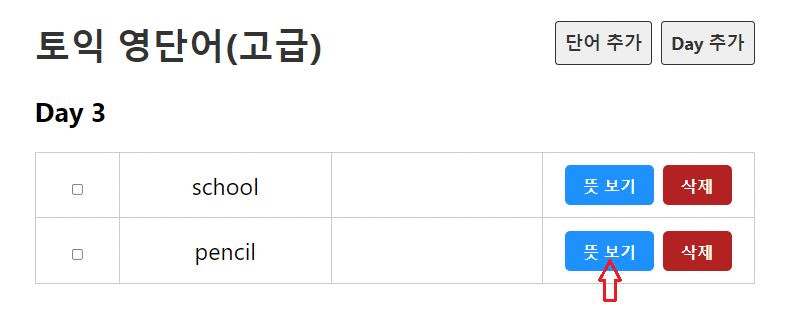 토글 기능으로 '뜻보기' 라는 버튼을 누르면 단어의 뜻이 나오고, '뜻숨기기' 라는 버튼을 누르면 단어가 감춰진다.