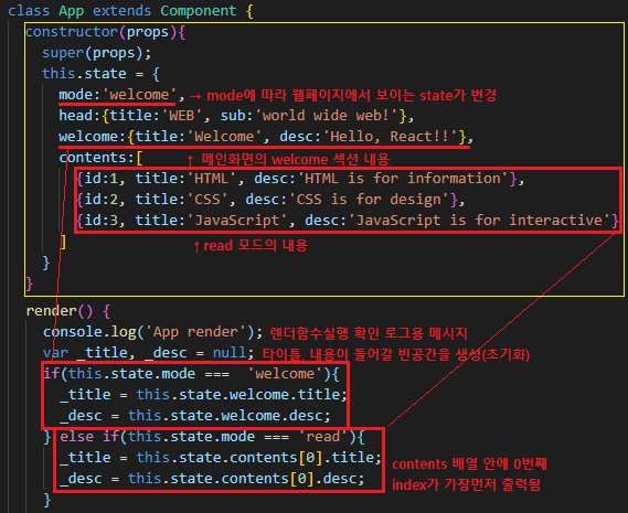- constructor()의 state에 웰컴모드와 내용을 추가한다.