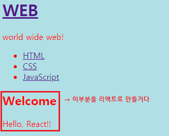 - props & state & event 이용해 WEB 링크를 클릭하면 welcome모드가 나오도록 만들기