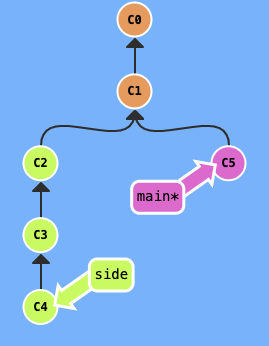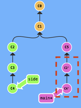 main 브랜치 뒤에 side 브랜치에서 가져온 c2 c4가 순서대로 붙었다 !