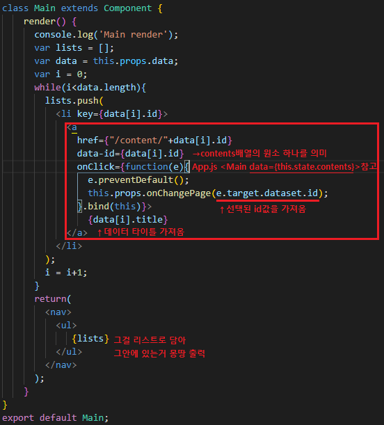 - 핸들러메소드 안에 this.props.onChagePage함수 (e.target.datatset.id)를 인자로 넣어준다. (페이지 변경해야하니깐)