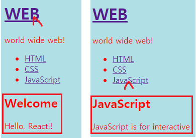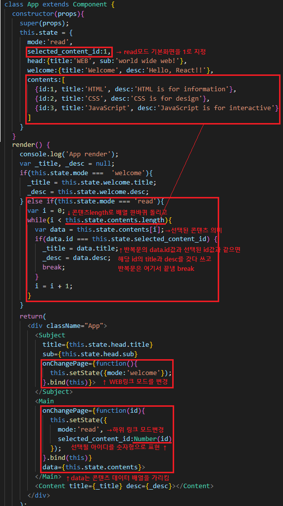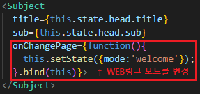 - 핸들러 메소드 안에는 this.setState({mode:'welcome'});을적어주어서 state, 즉 모드를 바꾼다.