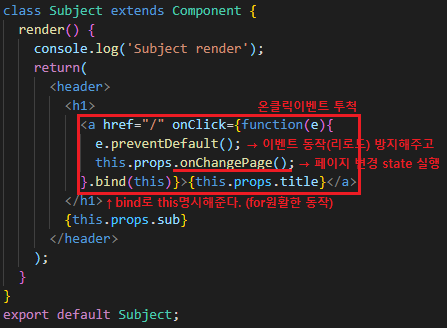 - onChangePage라는 props를 만들어준다. 그 안에 핸들러메소드 넣고 + 바인드함수를 사용해 this를 명시해준다