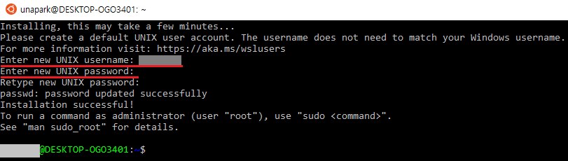 - cmd 가 켜지며 설치된다. username 과 password를 입력해주면 설치 완료!