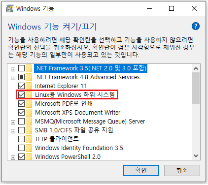 2. [Linux용 Windows 하위 시스템]를 체크하고 재시작해준다.