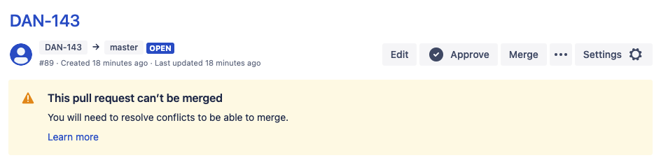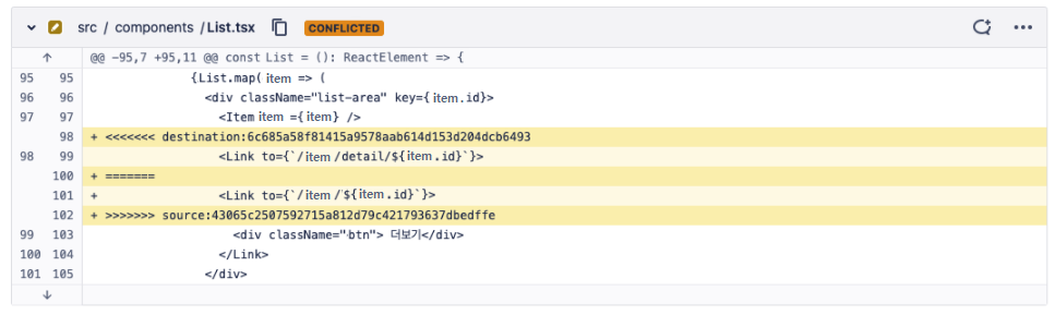 빗버킷으로 pull request 를 한 뒤 merge 를 하려던 참이였다. 그런데 conflict(충돌)가 나며 아래와 같은 메시지가 나왔다.