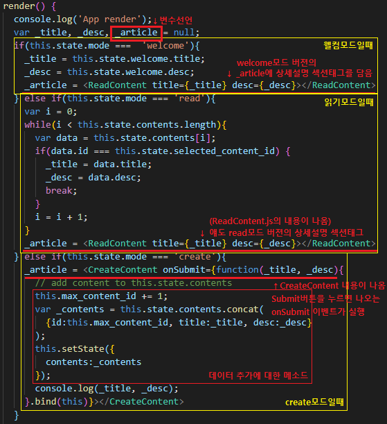 - render( )안에 if문에 따라 각 모드에서 실행될 _article = <ReadContent>태그 내용을 각각 넣어주기