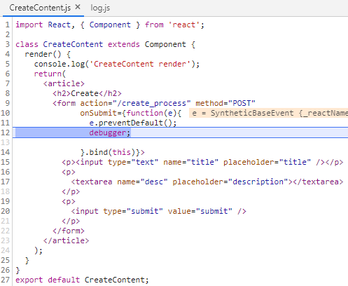 - 디버그 후, App.js에서 props로 지정한 onSubmit()을 실행, 인자로는 title과 desc의 값을 넣어주었다.