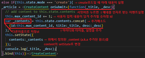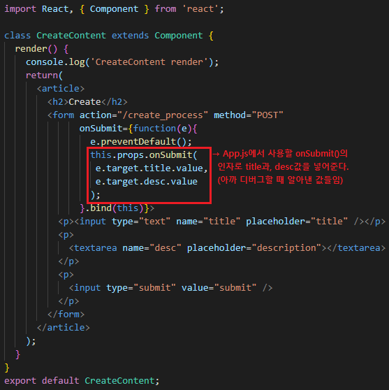 - <CreateContent>안에 onSubmit이라는 prop을 추가한다. 핸들러메소드 인자로 _title과 _desc를 받는다.