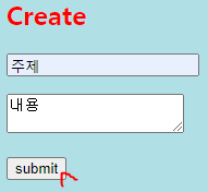 create 링크 클릭시 화면하단에 create 섹션과 입력폼이 생긴다. 내용 입력 후 submit 버튼을 누르면