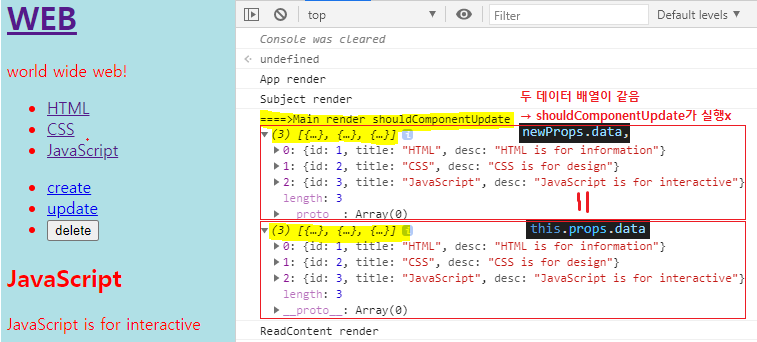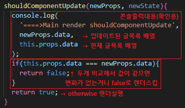 newProps.data(업데이트된 값) = this.props.data(현재 값) 이면