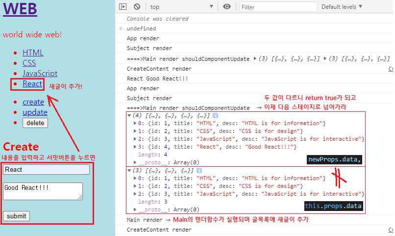 → 값의 변경이 있다는 의미, 렌더함수 실행 o (create로 글을 입력하면 Main의 렌더가 실행o)