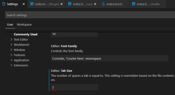 2. 스크롤 굴려 내려가면 Tab Size 가 보인다. 숫자를 변경해주자 ! 그럼 끝