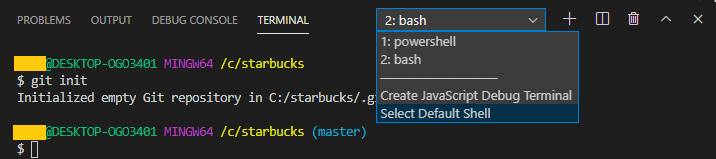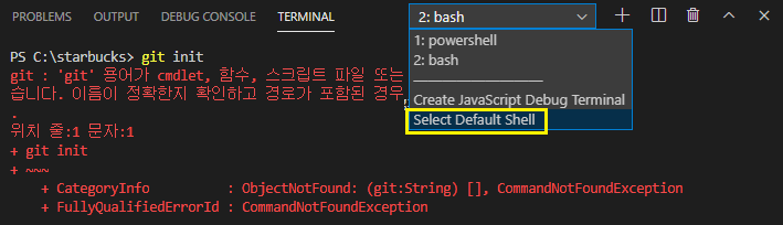 4. 터미널을 Bash로 변경해주면 git init이 잘 실행되는 것을 볼 수 있다.