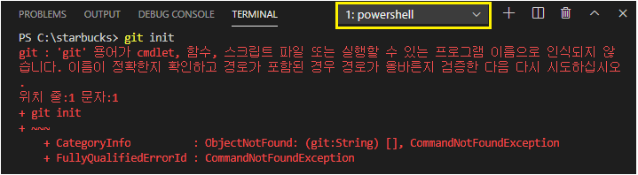 'git' 용어가 cmdlet, 함수, 스크립트 파일 또는 실행할 수 있는 프로그램 이름으로 인식되지 않습니다.