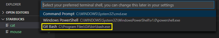 3. Git Bash 선택. (바로 안될 것이다) 잊지말고 터미널 한번 껏다 다시 켜주자.