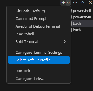 2. 터미널 드랍다운 선택 후 Selected Default Shell을 선택