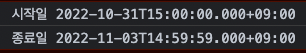 특히 종료일은 선택한 날짜인 11 / 3 일(KST 기준) 의 23: 59: 59 초 까지로 표기 되어야 한다.