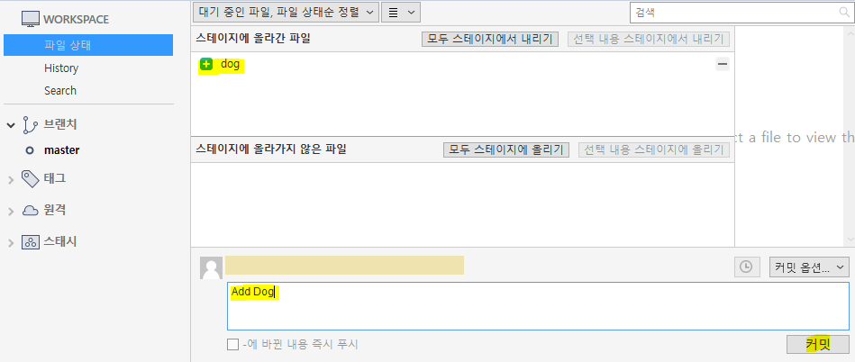 - stage에 올린 dog 파일을 Git에도 적용시키기 위해 커밋명을 간단히 적어주고 커밋해준다.