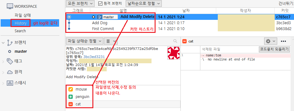- History 메뉴를 보면 커밋 히스토리와 세부 내용을 확인할 수 있다.