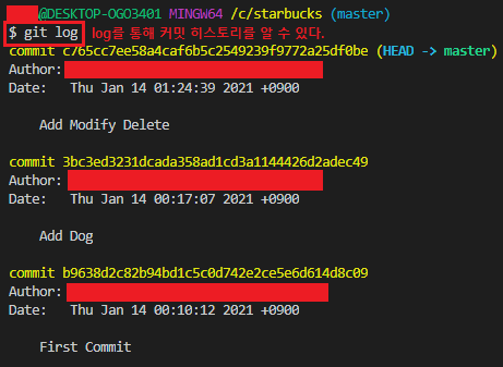 - 터미널에서도 git log 명령어를 통해 커밋 히스토리를 확인할 수 있다.
