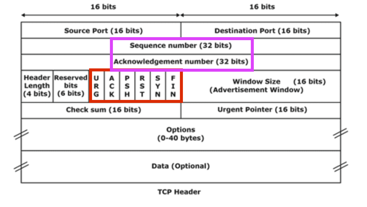 - → URG(긴급, 최우선) ACK(확인) SYN(요청) FIN(완료) RST(리셋) PSH(푸쉬)