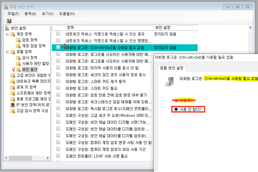 로컬보안정책 - Ctrl+Alt+Del 키를 눌러 로그온 하기