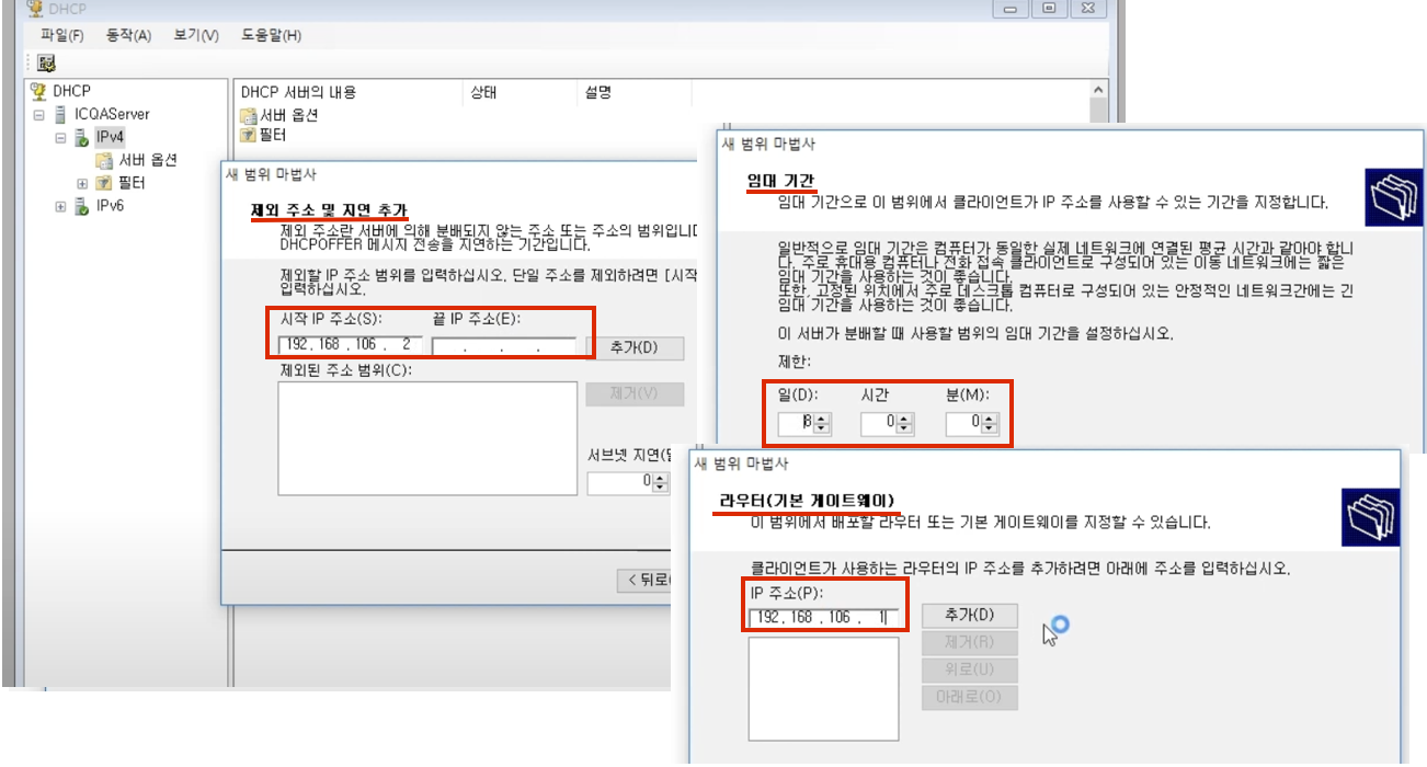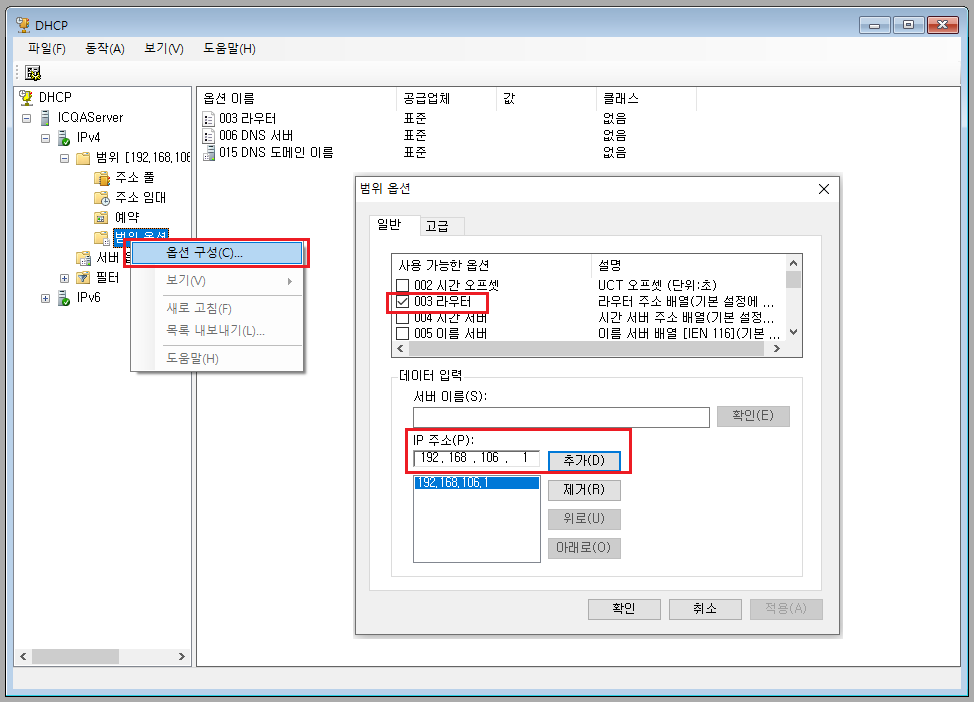 - Router의 DHCP 네트워크를 192.168.100.0/24, 서버이름은 'icqa' 로 설정하시오