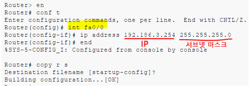 n 라우터 아이피 설정 | ![]() ** int fa0/0 fa 는 interface fastethernet0/0 의 약자이다. |