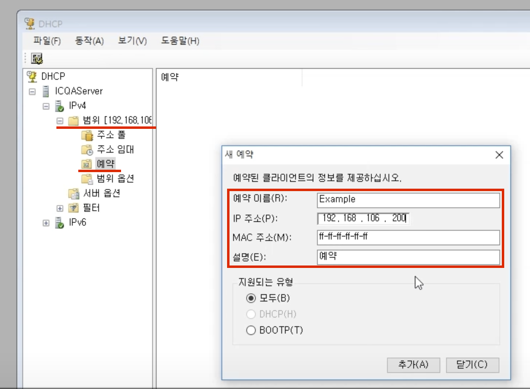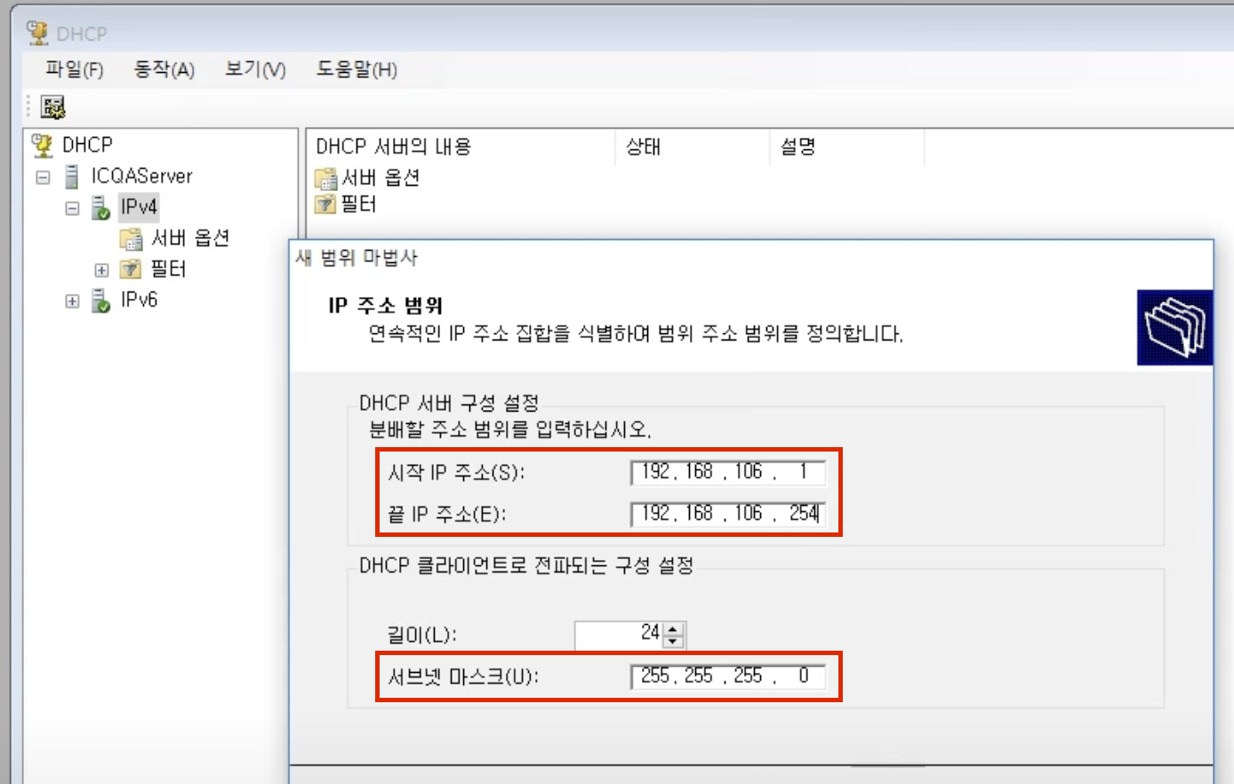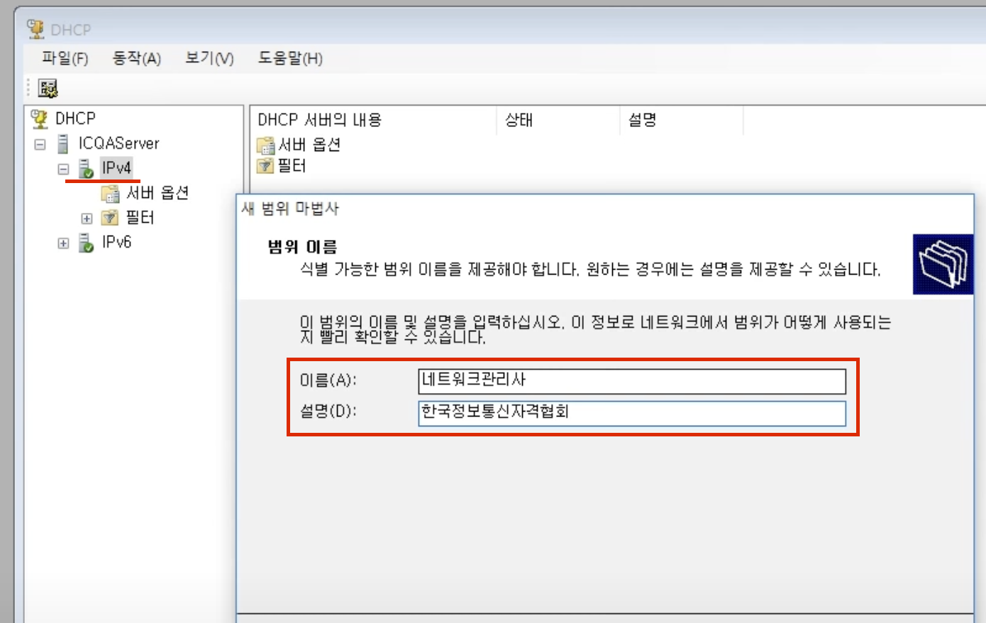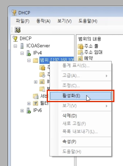 DHCP에서 IPv4 를 우클릭해서 설정해주자