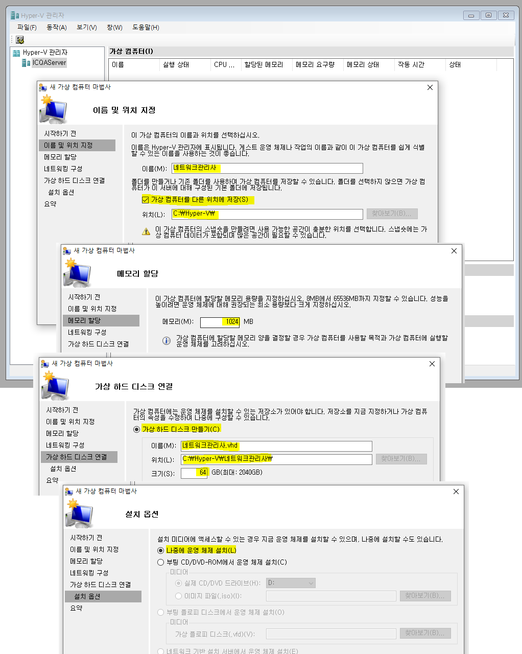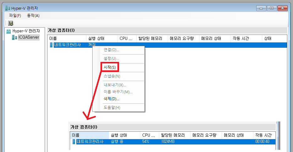 [마침] 을 누르면 가상 컴퓨터가 생성되었다. 오른쪽 우클릭 후 시작을 누르면 가상 컴퓨터가 켜진다.