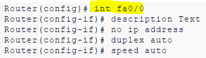 Router(config)# int fa 0/0 (인터페이스 설정 진입)
