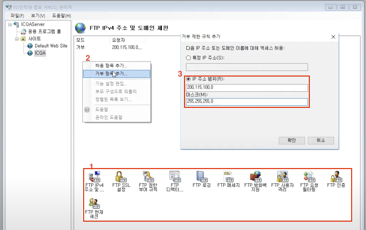 - 여러 설정 옵션 아이콘 들 중 FTP IPv4 주소 및 도메인 제한 을 눌러 거부항목을 추가해주자