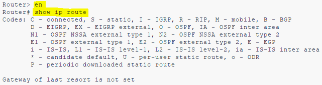 | > ip route 0.0.0.0 0.0.0.0 serial 0/1 | 라우팅 테이블에 없는 목적지인 경우, serial 0/1 로 내보냄 | |