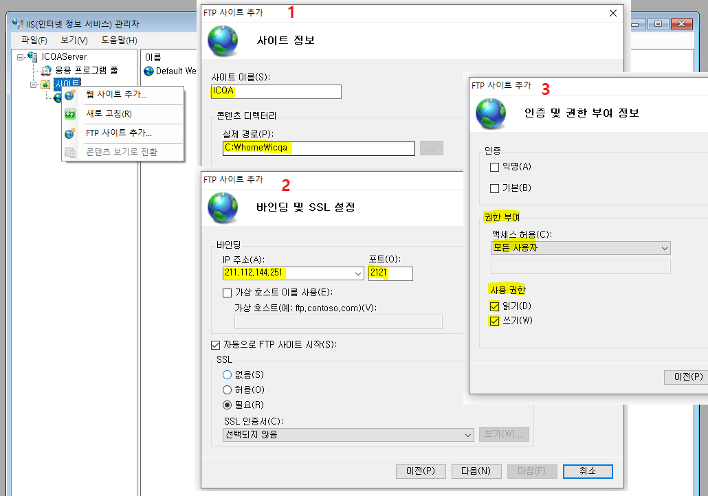 IIS(인터넷 정보 서비스) 관리자에서 마우스 우클릭 후, FTP 사이트 추가를 한다