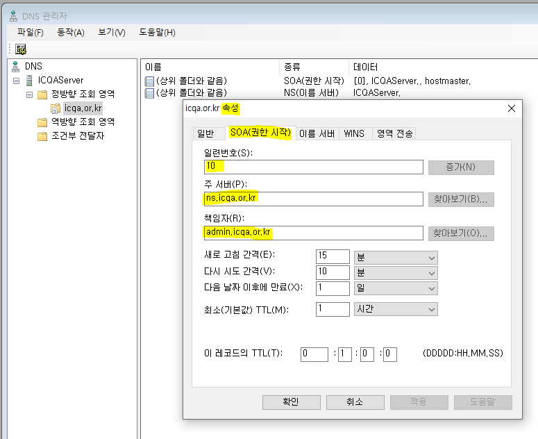 (10 ; Serial 15분 ; Refresh 10분 ; Retry 1일 ; Expire 1시간 ; Minimun)