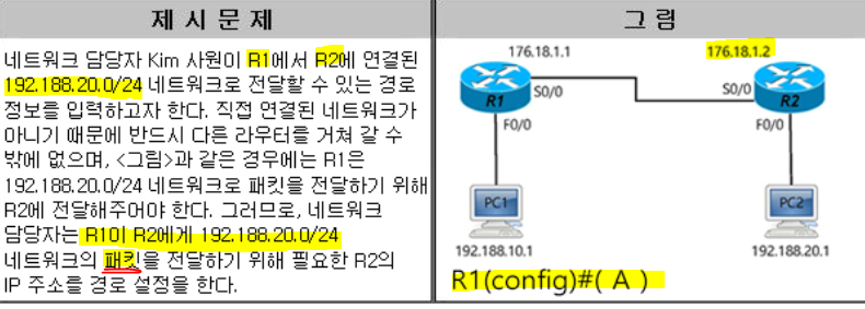 ip route 해당IP주소 서브넷마스크 해당인터페이스 IP 주소가 접근할때 해당인터페이스로 보낸다. |