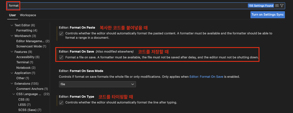 format 검색해주고 Format on Save 체크되어있는지 확인해준다