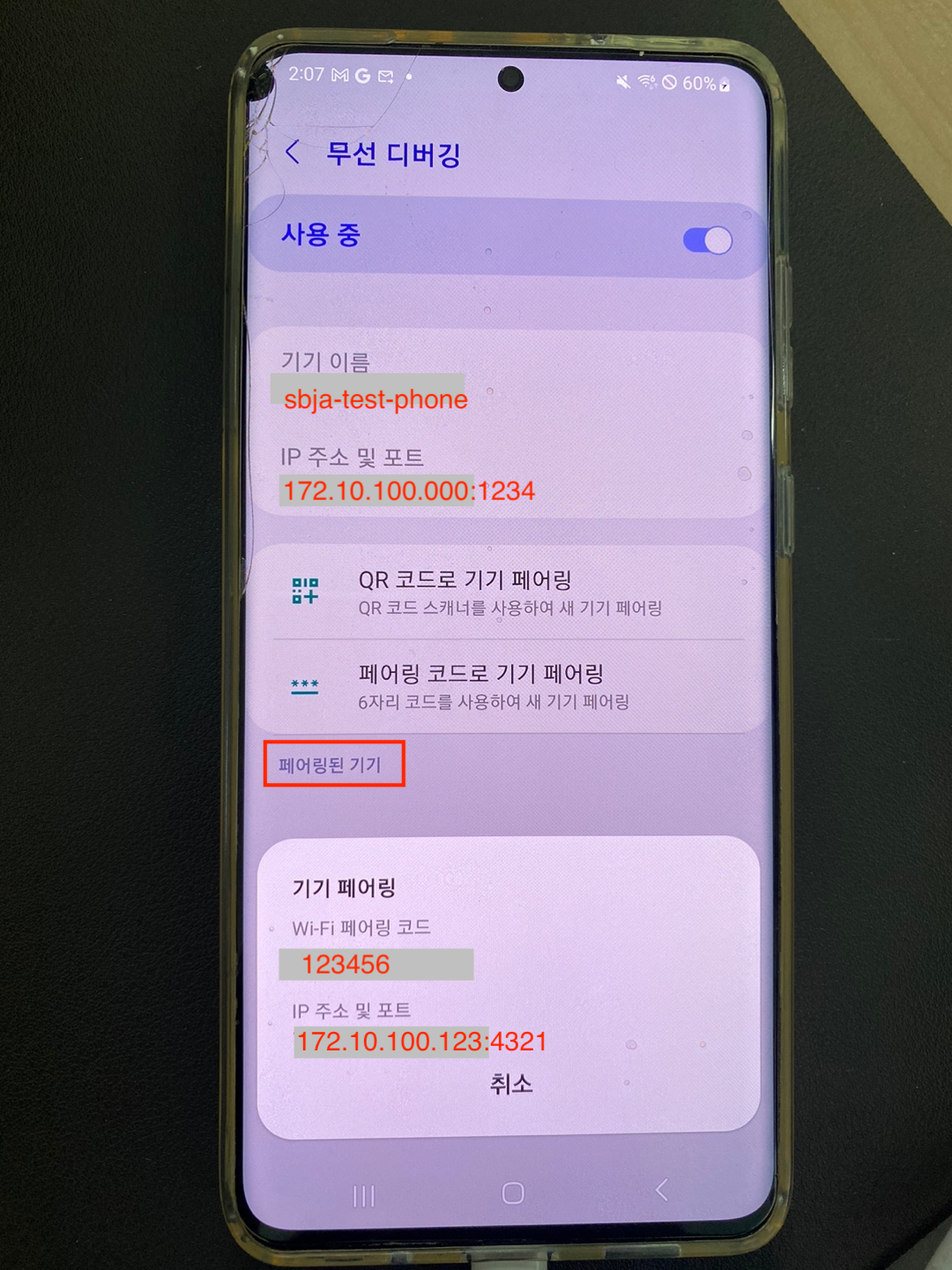 [설정] - [개발자 도구] - [무선 디버깅] - [페어링된 기기] 를 누른다