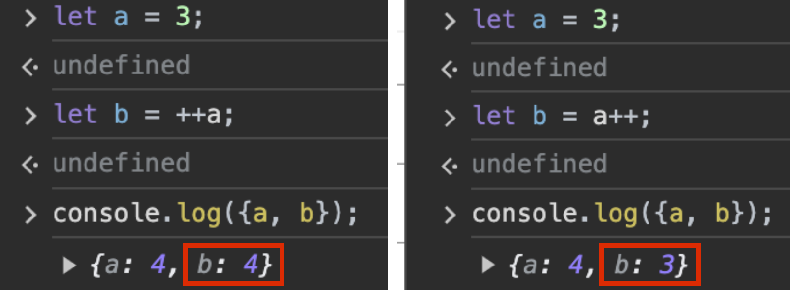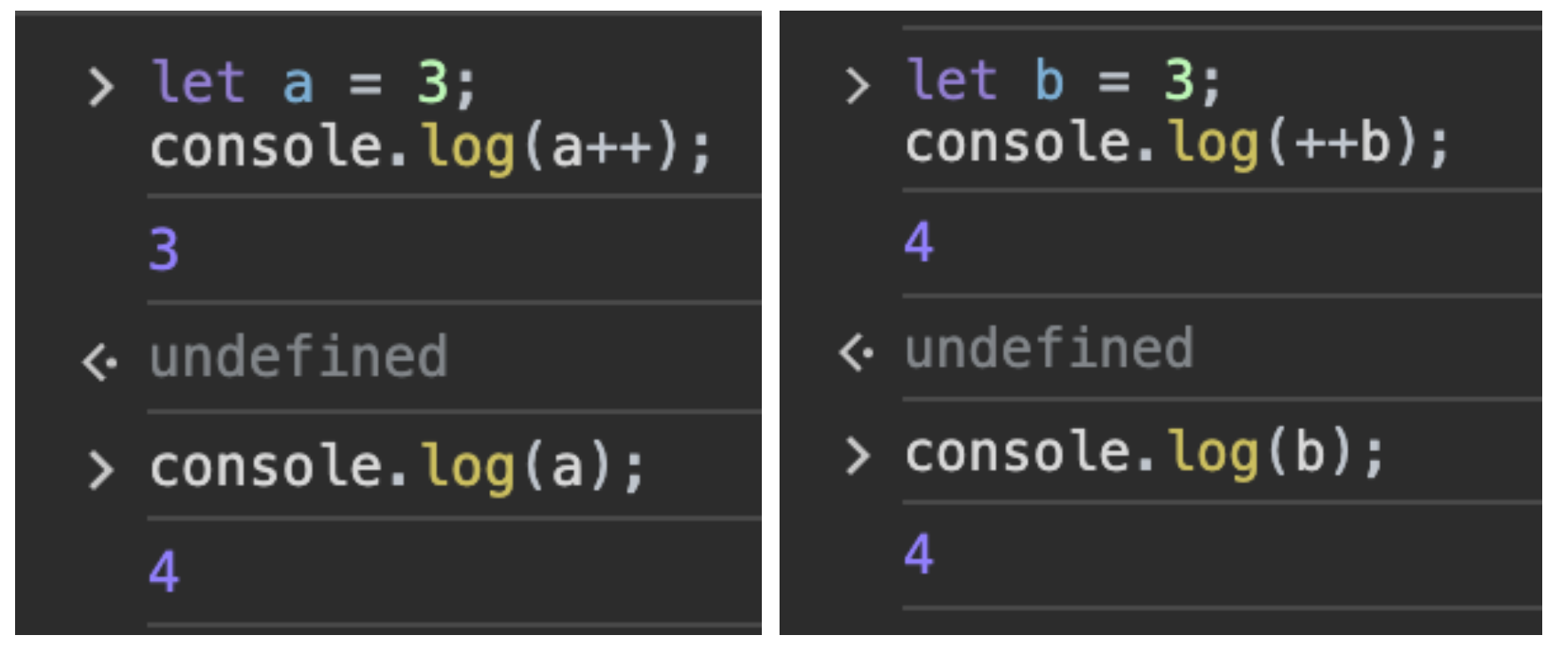 변수 b에 순수a 의 값이 할당(선할당)되느냐 아니면 ++a의 연산된 값이 할당(후증가)이다