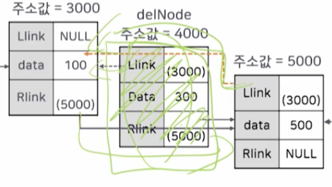 // 삭제할 노드의 오른쪽(다음)노드의 이전 값을 = delNode의 왼쪽 링크(이전 노드)로 변경