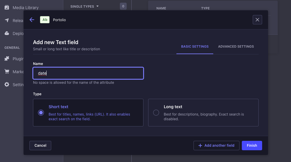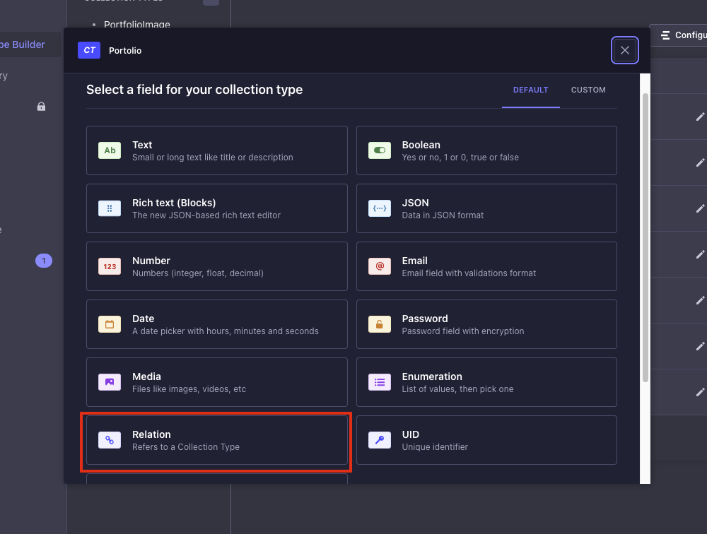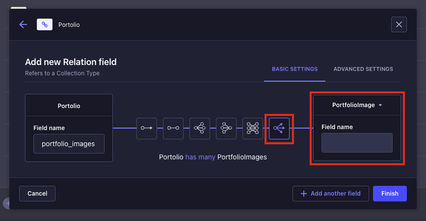 7. 만약 데이터가 객체나 배열의 형식이라면 Relation field 를 설정해준다.