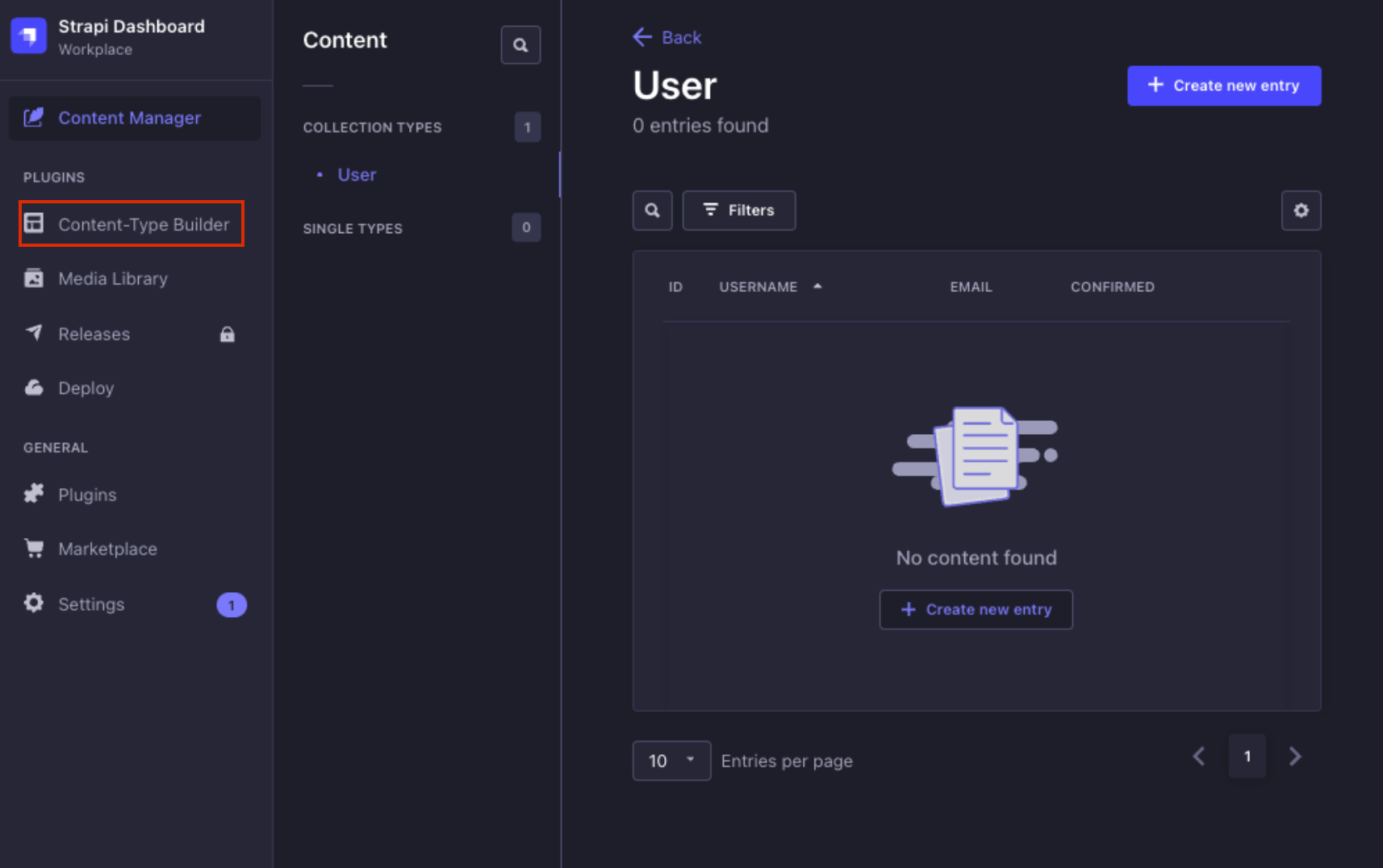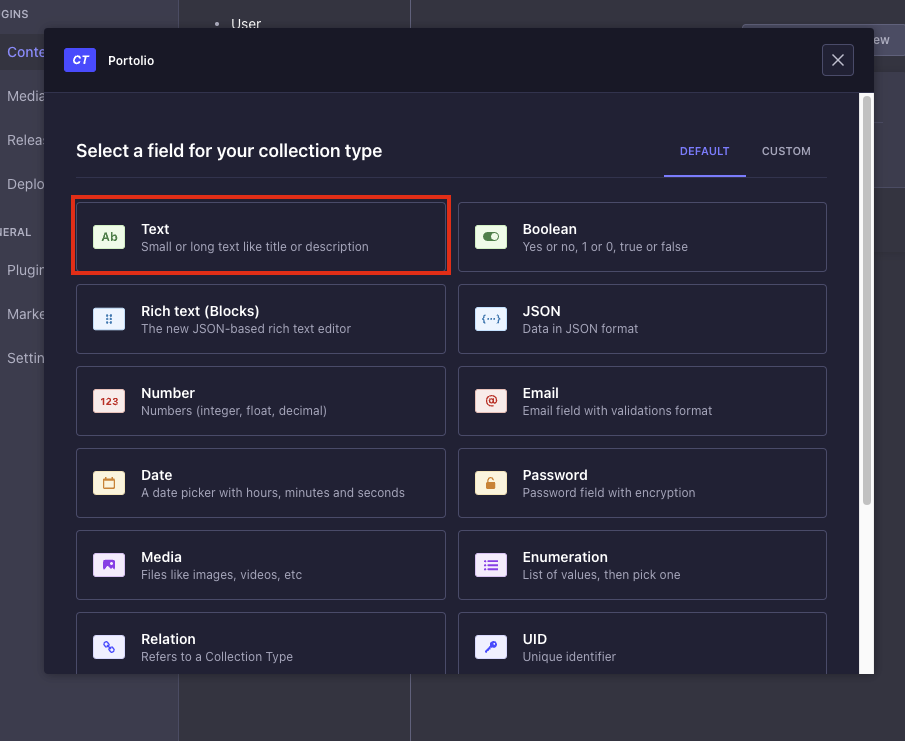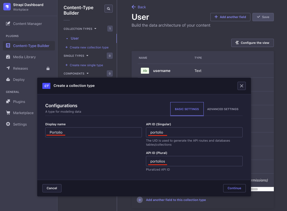 2. Content-Type Builder - Create new collection type 으로 생성해주자