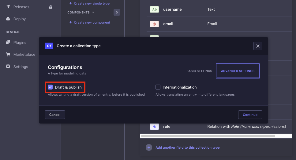 4. Advanced setting - Draft & publish 하는 기능에 체크를 해두었다