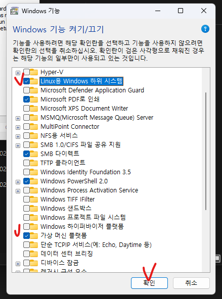 아래 보이는 ✅ linux 용 winows 하위시스템과 ✅가상머신 플랫폼 에 체크해준다