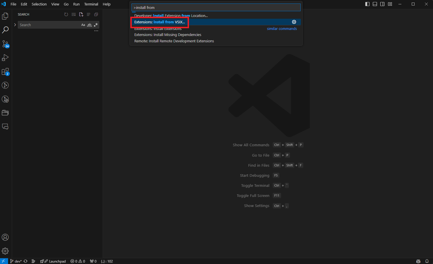 4. install from VSIX 검색해서 클릭하면 파일 탐색기가 나온다 :) 파일 선택해주기
