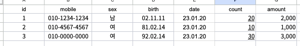 구글 스프레드 시트에서 API 연동을 지정해준 시트 내에서 이렇게 간단한 테스트용 테이블을 만들었다.