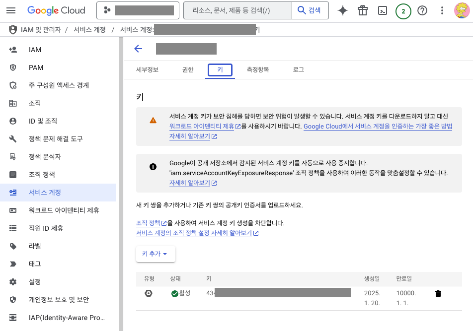 참고로 서비스 계정을 만들때 [키] 탭에서 발급받은 id 와 private_key_id 가 일치했기 때문에 api key 로 착각을 하게 되었던 것...!